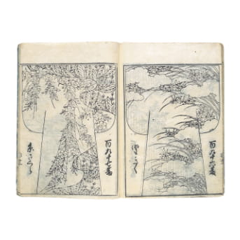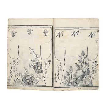 雛形本とは、いわゆる「小袖の見本帳」です。流行りの小袖模様や意匠を描いた木版刷りの冊子で、江戸時代中期に数多く刊行されました。小袖の背面図を中心に、文様や技法、配色などを示すのが一般的な形式です。再版を含めた出版総数は200種類弱といわれ、史料館はその約半数を所蔵しており、コレクションとしては国内最大級です。
