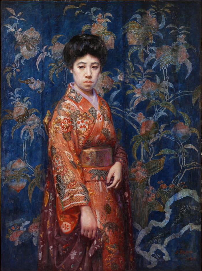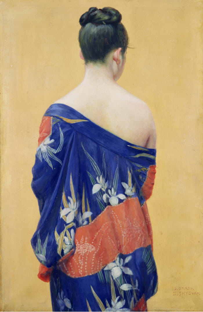 画家としての名声もさることながら小袖や裂など染織工芸品の収集家としても有名で、そのコレクションは質量ともに他の追随を許さぬ素晴らしさでした。超一流のコレクターであり、鋭い鑑識眼も備えていた岡田三郎助は、自身が収集した衣裳をモデルに着せて筆をふるい、「あやめの衣」「支那絹の前」「来信」などの名画を残しました。その作品のモデルが着ていた衣裳の数々が松坂屋コレクションに残されているのです。