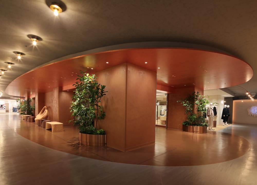 日本発のコンテンポラリーなファッションやライフスタイルのブランドを中心に展開する本館4階を象徴するフロア中央は、一つの柱から放射線状に広がるような構成で、大きな木の下にブランドが集まる空間となっています。