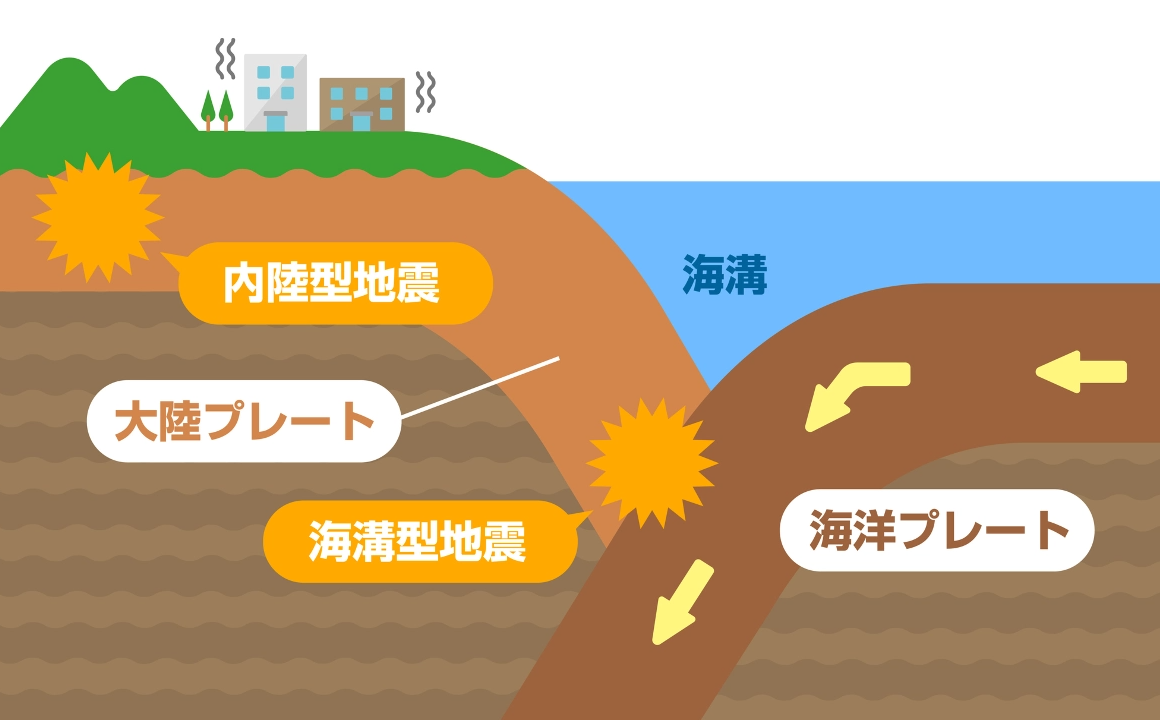 日本で起きる地震の種類には2つあり、1つは大陸プレートが海洋プレートの動きの影響を受ける「境界地震」、もう1つは海岸から遠い、陸地の内部の地殻内で発生する「内陸地震」です。境界地震は2つのプレートの摩擦により発生し、内陸地震は地殻そのものに働く圧縮力により発生するところが2つの地震の大きな違いです。