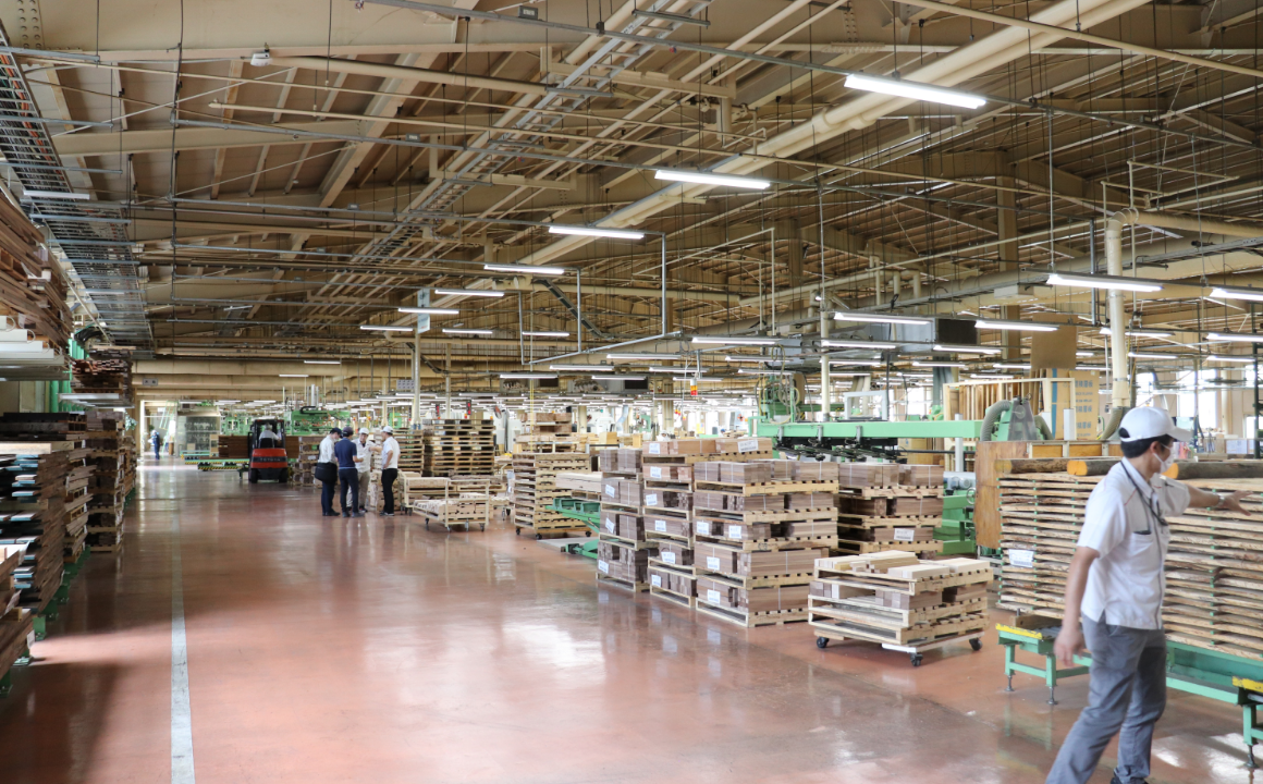 今回は座談会の前に、資材の入荷と板材の仕分け、乾燥から家具の部品作りを行っている知多カリモクの工場を見学させていただきました。
