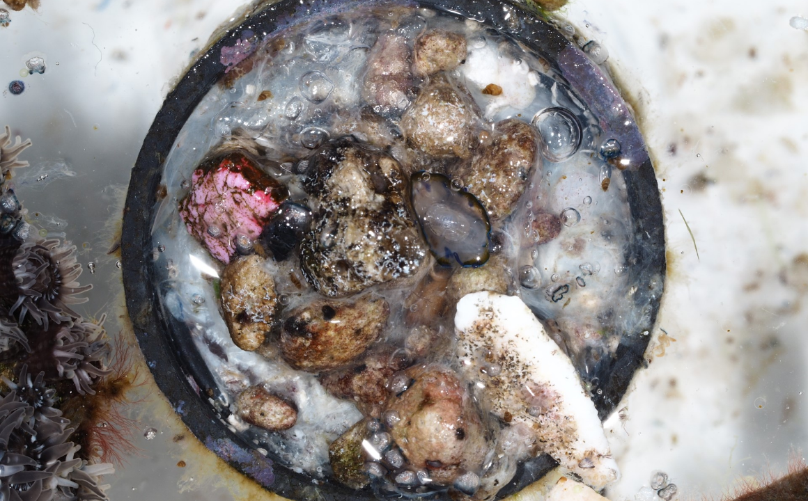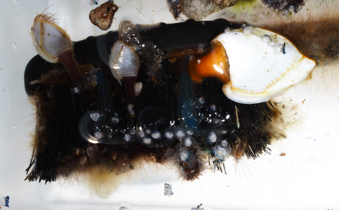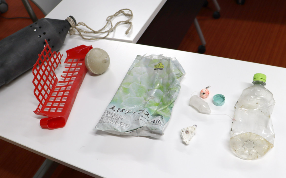 私は普段、船に乗って生き物をサンプリングしているのですが、その過程でプラスチックが採れることがあります。歯ブラシやペットボトルのキャップなどに生き物が巣を作っていて、巣を作ることによってさらに生き物が集まってくるので、巣の中にはさまざまな種類の生き物がいます。海岸でも、生き物が生息している発泡スチロールを見つけることがあります。このように、生き物が自分たちの生活にプラスチックを利用してしまうことがあるのです。