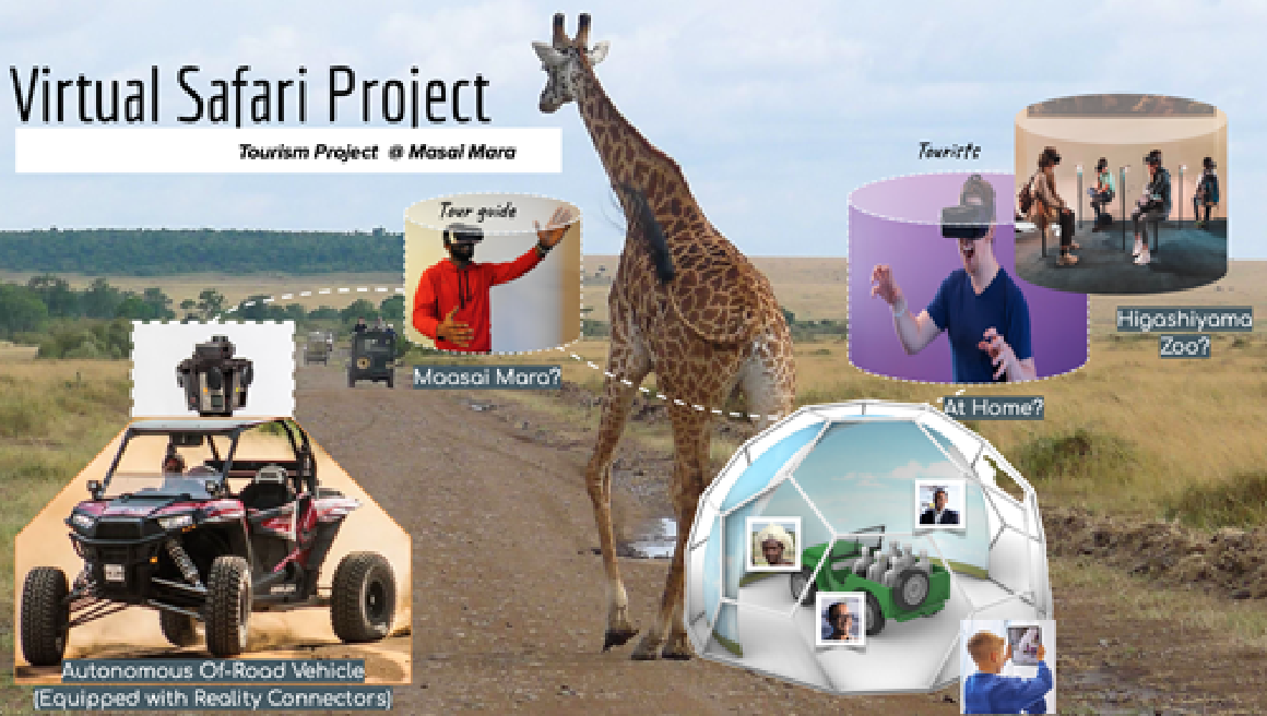ケニアのマサイ・マラ国立公園と東山動植物園を融合させた空間をVRの中に作って、希少な動物をみんなで探す旅を実現するシステムを、学生たちが中心となり構築しています。今まで、他の人のリアリティを感じるためには、基本的には相手の空間に飛び込む必要がありました。たとえば私たちがケニアに行くと、ケニアのこともわかりますし、同時に自分たちが日本人であることを思い知るわけです。ただし、ケニアの方々にとっては普段の日常だからあまりリアリティは変化しません。ではケニアの人に日本に来てもらうといいのかというと、ケニアの人は自分たちがどんなケニア人なのかはわかるけれど、日本にいる日本人にはわからない。つまり、非対称なわけです。そこの対称性を高める工夫ができないかと思っています。