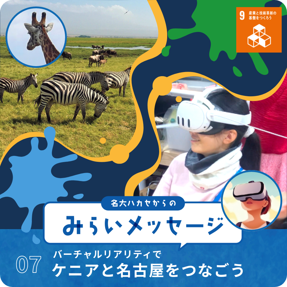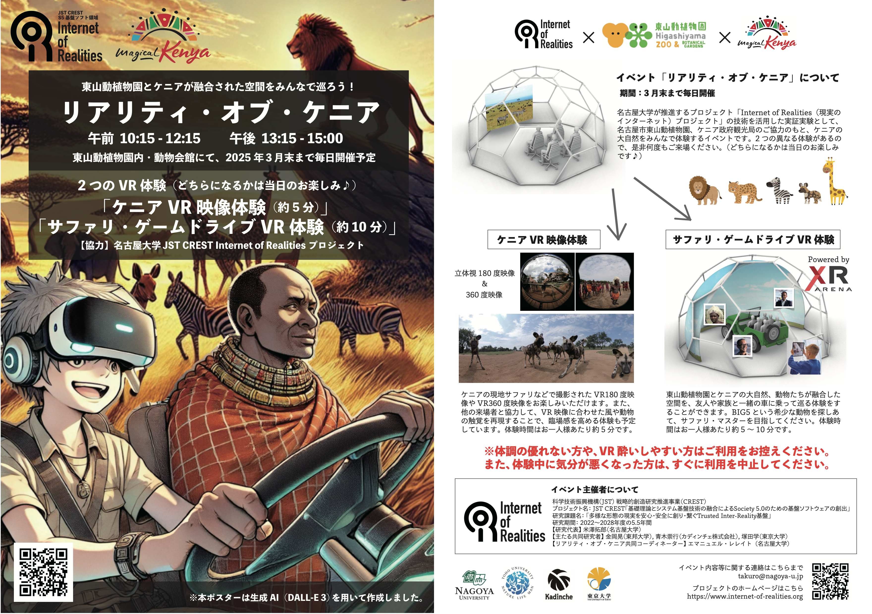 レレイト先生 今回、名古屋大学が代表となり推進する研究開発事業JST CREST Internet of Realitiesプロジェクトの技術実証の場として東山動植物園様に協力いただき、東山動植物園とケニアを融合したバーチャル・リアリティ(VR)空間を楽しんでいただけるイベント「東山動植物園 リアリティ・オブ・ケニア」を開催しています。(2025年3月末まで)