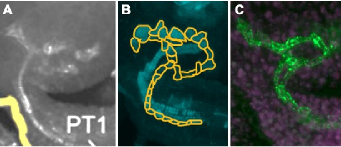 B:カロースが蓄積した笠原ゲートウェイ。各細胞は黄色で縁取りした。ここにカロースがたまることによって種子への栄養が制限される。