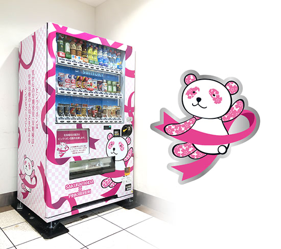 乳がんの早期診断、発見、治療を促す「ピンクリボン運動」に取り組んでいます。啓発冊子の配布やマンモグラフィー検診体験のほか、さくらパンダを採用したピンクリボンピンバッジを販売。収益金の一部を名古屋ピンクリボンフェスタ実行委員会に寄付しています。また、店内にはピンクリボン自販機を設置し、自販機の売上の一部を同委員会へ寄付し乳がん検診の啓発活動に役立てています。