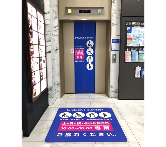 ベビーカー・車イスをご利用のお客様や、お身体の不自由なお客様、妊婦のお客様が、混雑なくエレベーターをご利用いただけるよう、土・日・祝・その他特定日に限り一部のエレベータを専用で運転しています。